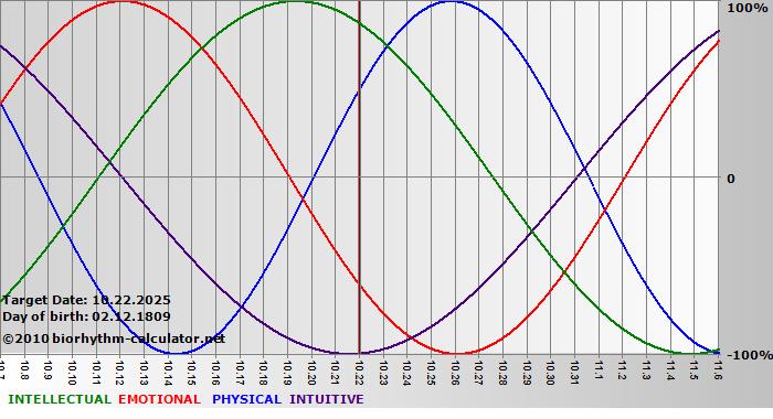 Your biorhythm above the horizontal line indicates that your capacity in that area is enhanced; you feel stronger, more alert, more connected, more empathetic. These are times when you are able to do more, be more, enjoy more. When the biorhythm lines are below 0%, your capacity is diminished, and conservative behavior is recommended.