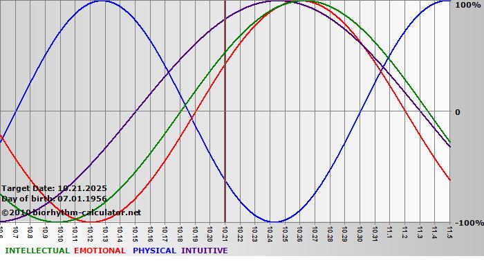 Your biorhythm above the horizontal line indicates that your capacity in that area is enhanced; you feel stronger, more alert, more connected, more empathetic. These are times when you are able to do more, be more, enjoy more. When the biorhythm lines are below 0%, your capacity is diminished, and conservative behavior is recommended.