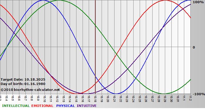 Your biorhythm above the horizontal line indicates that your capacity in that area is enhanced; you feel stronger, more alert, more connected, more empathetic. These are times when you are able to do more, be more, enjoy more. When the biorhythm lines are below 0%, your capacity is diminished, and conservative behavior is recommended.