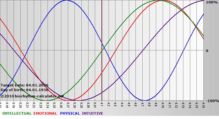 Your biorhythm above the horizontal line indicates that your capacity in that area is enhanced; you feel stronger, more alert, more connected, more empathetic. These are times when you are able to do more, be more, enjoy more. When the biorhythm lines are below 0%, your capacity is diminished, and conservative behavior is recommended.