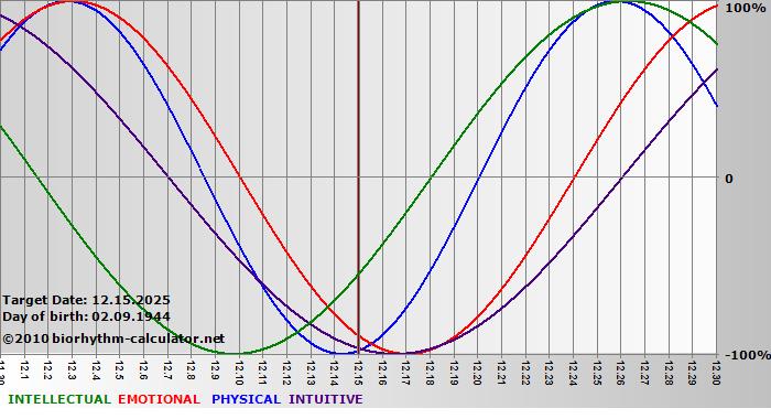 Your biorhythm above the horizontal line indicates that your capacity in that area is enhanced; you feel stronger, more alert, more connected, more empathetic. These are times when you are able to do more, be more, enjoy more. When the biorhythm lines are below 0%, your capacity is diminished, and conservative behavior is recommended.
