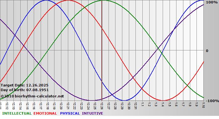 Your biorhythm above the horizontal line indicates that your capacity in that area is enhanced; you feel stronger, more alert, more connected, more empathetic. These are times when you are able to do more, be more, enjoy more. When the biorhythm lines are below 0%, your capacity is diminished, and conservative behavior is recommended.