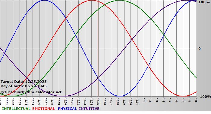 Your biorhythm above the horizontal line indicates that your capacity in that area is enhanced; you feel stronger, more alert, more connected, more empathetic. These are times when you are able to do more, be more, enjoy more. When the biorhythm lines are below 0%, your capacity is diminished, and conservative behavior is recommended.