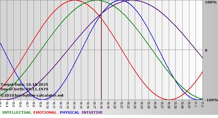 Your biorhythm above the horizontal line indicates that your capacity in that area is enhanced; you feel stronger, more alert, more connected, more empathetic. These are times when you are able to do more, be more, enjoy more. When the biorhythm lines are below 0%, your capacity is diminished, and conservative behavior is recommended.