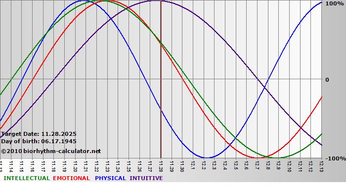 Your biorhythm above the horizontal line indicates that your capacity in that area is enhanced; you feel stronger, more alert, more connected, more empathetic. These are times when you are able to do more, be more, enjoy more. When the biorhythm lines are below 0%, your capacity is diminished, and conservative behavior is recommended.