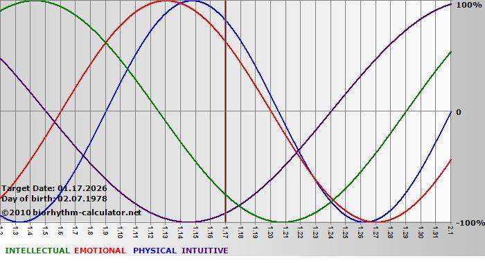 Your biorhythm above the horizontal line indicates that your capacity in that area is enhanced; you feel stronger, more alert, more connected, more empathetic. These are times when you are able to do more, be more, enjoy more. When the biorhythm lines are below 0%, your capacity is diminished, and conservative behavior is recommended.