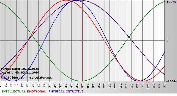 Your biorhythm above the horizontal line indicates that your capacity in that area is enhanced; you feel stronger, more alert, more connected, more empathetic. These are times when you are able to do more, be more, enjoy more. When the biorhythm lines are below 0%, your capacity is diminished, and conservative behavior is recommended.