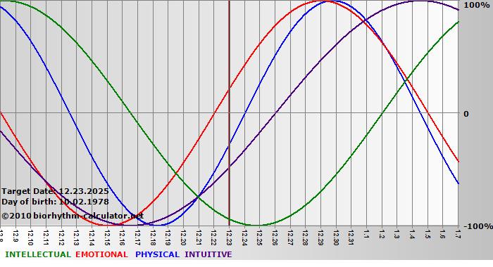 Your biorhythm above the horizontal line indicates that your capacity in that area is enhanced; you feel stronger, more alert, more connected, more empathetic. These are times when you are able to do more, be more, enjoy more. When the biorhythm lines are below 0%, your capacity is diminished, and conservative behavior is recommended.