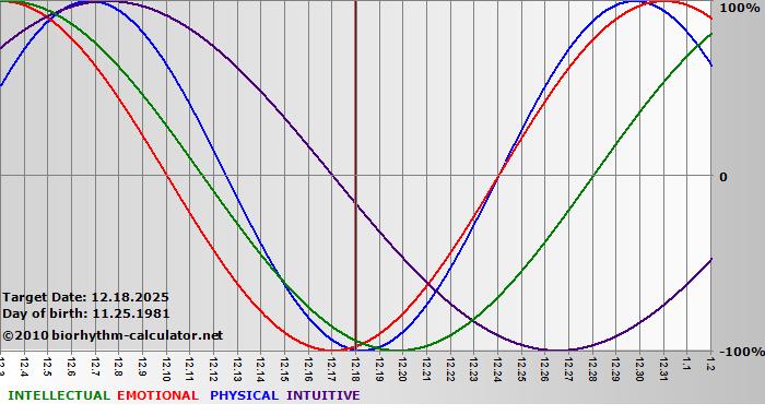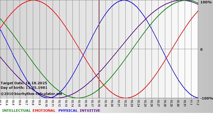 Your biorhythm above the horizontal line indicates that your capacity in that area is enhanced; you feel stronger, more alert, more connected, more empathetic. These are times when you are able to do more, be more, enjoy more. When the biorhythm lines are below 0%, your capacity is diminished, and conservative behavior is recommended.