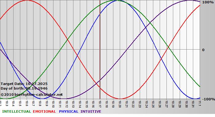 Your biorhythm above the horizontal line indicates that your capacity in that area is enhanced; you feel stronger, more alert, more connected, more empathetic. These are times when you are able to do more, be more, enjoy more. When the biorhythm lines are below 0%, your capacity is diminished, and conservative behavior is recommended.