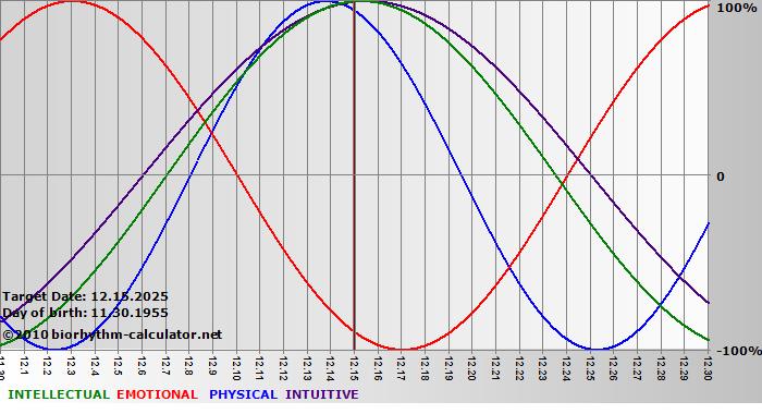 Your biorhythm above the horizontal line indicates that your capacity in that area is enhanced; you feel stronger, more alert, more connected, more empathetic. These are times when you are able to do more, be more, enjoy more. When the biorhythm lines are below 0%, your capacity is diminished, and conservative behavior is recommended.