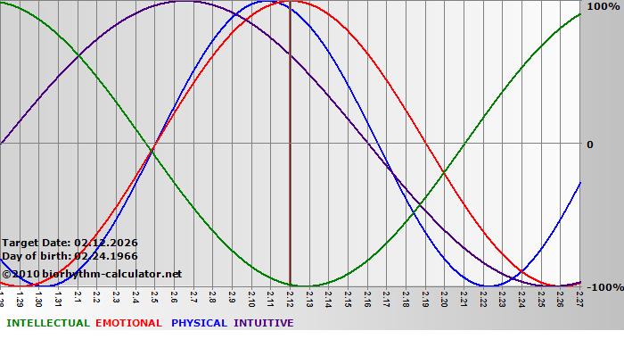Your biorhythm above the horizontal line indicates that your capacity in that area is enhanced; you feel stronger, more alert, more connected, more empathetic. These are times when you are able to do more, be more, enjoy more. When the biorhythm lines are below 0%, your capacity is diminished, and conservative behavior is recommended.