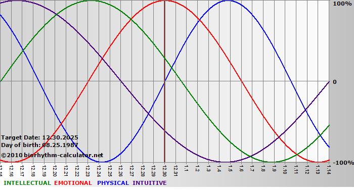 Your biorhythm above the horizontal line indicates that your capacity in that area is enhanced; you feel stronger, more alert, more connected, more empathetic. These are times when you are able to do more, be more, enjoy more. When the biorhythm lines are below 0%, your capacity is diminished, and conservative behavior is recommended.