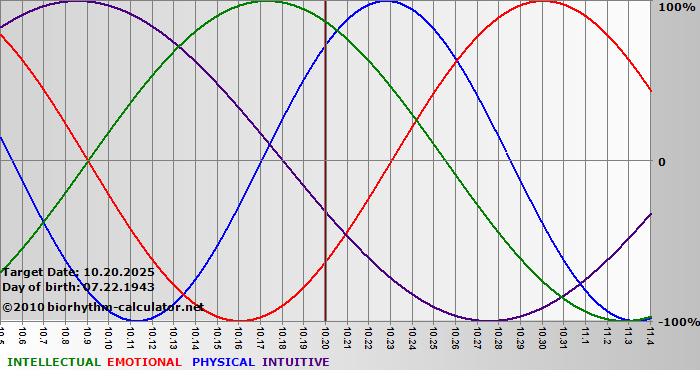 Your biorhythm above the horizontal line indicates that your capacity in that area is enhanced; you feel stronger, more alert, more connected, more empathetic. These are times when you are able to do more, be more, enjoy more. When the biorhythm lines are below 0%, your capacity is diminished, and conservative behavior is recommended.
