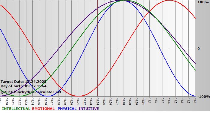 Your biorhythm above the horizontal line indicates that your capacity in that area is enhanced; you feel stronger, more alert, more connected, more empathetic. These are times when you are able to do more, be more, enjoy more. When the biorhythm lines are below 0%, your capacity is diminished, and conservative behavior is recommended.