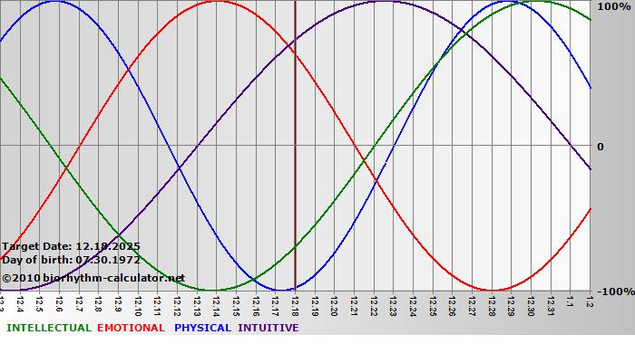 Your biorhythm above the horizontal line indicates that your capacity in that area is enhanced; you feel stronger, more alert, more connected, more empathetic. These are times when you are able to do more, be more, enjoy more. When the biorhythm lines are below 0%, your capacity is diminished, and conservative behavior is recommended.