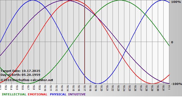 Your biorhythm above the horizontal line indicates that your capacity in that area is enhanced; you feel stronger, more alert, more connected, more empathetic. These are times when you are able to do more, be more, enjoy more. When the biorhythm lines are below 0%, your capacity is diminished, and conservative behavior is recommended.