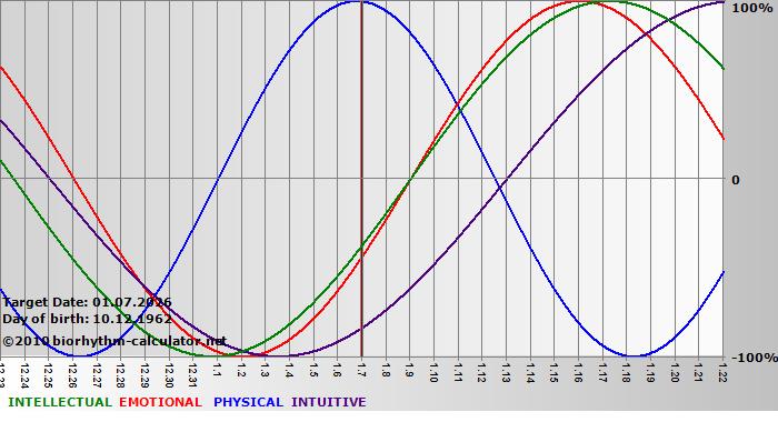 Your biorhythm above the horizontal line indicates that your capacity in that area is enhanced; you feel stronger, more alert, more connected, more empathetic. These are times when you are able to do more, be more, enjoy more. When the biorhythm lines are below 0%, your capacity is diminished, and conservative behavior is recommended.