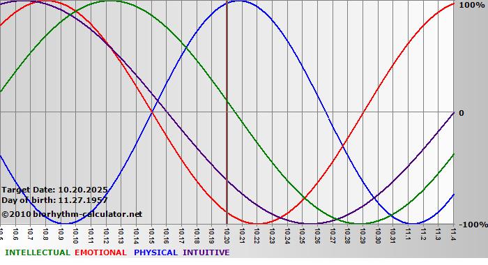 Your biorhythm above the horizontal line indicates that your capacity in that area is enhanced; you feel stronger, more alert, more connected, more empathetic. These are times when you are able to do more, be more, enjoy more. When the biorhythm lines are below 0%, your capacity is diminished, and conservative behavior is recommended.