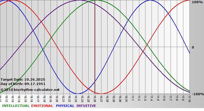 Your biorhythm above the horizontal line indicates that your capacity in that area is enhanced; you feel stronger, more alert, more connected, more empathetic. These are times when you are able to do more, be more, enjoy more. When the biorhythm lines are below 0%, your capacity is diminished, and conservative behavior is recommended.