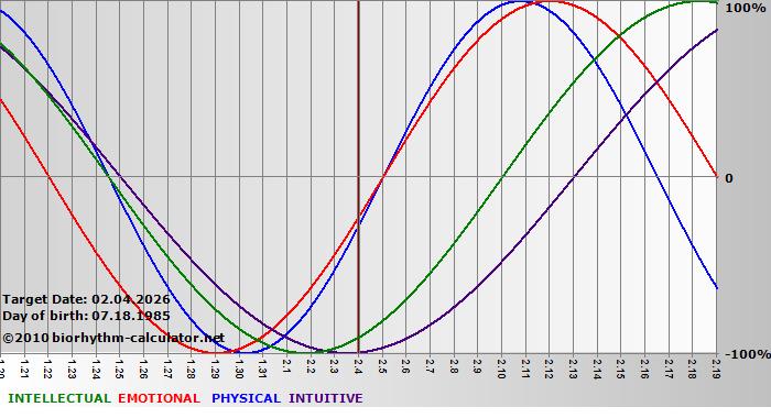 Your biorhythm above the horizontal line indicates that your capacity in that area is enhanced; you feel stronger, more alert, more connected, more empathetic. These are times when you are able to do more, be more, enjoy more. When the biorhythm lines are below 0%, your capacity is diminished, and conservative behavior is recommended.
