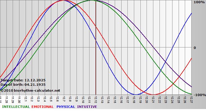 Your biorhythm above the horizontal line indicates that your capacity in that area is enhanced; you feel stronger, more alert, more connected, more empathetic. These are times when you are able to do more, be more, enjoy more. When the biorhythm lines are below 0%, your capacity is diminished, and conservative behavior is recommended.