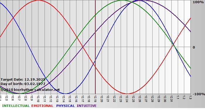 Your biorhythm above the horizontal line indicates that your capacity in that area is enhanced; you feel stronger, more alert, more connected, more empathetic. These are times when you are able to do more, be more, enjoy more. When the biorhythm lines are below 0%, your capacity is diminished, and conservative behavior is recommended.