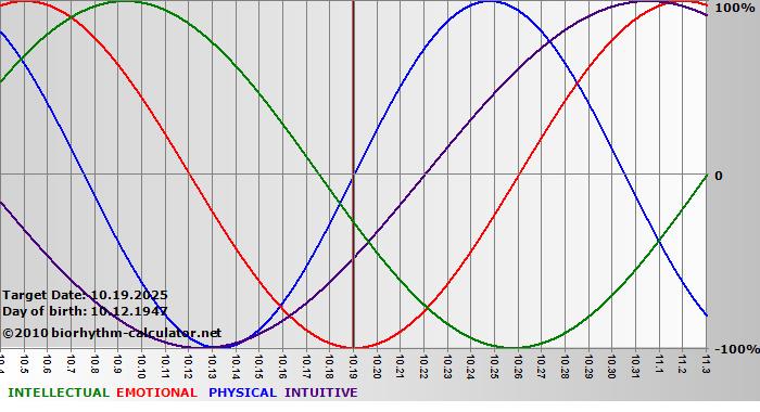 Your biorhythm above the horizontal line indicates that your capacity in that area is enhanced; you feel stronger, more alert, more connected, more empathetic. These are times when you are able to do more, be more, enjoy more. When the biorhythm lines are below 0%, your capacity is diminished, and conservative behavior is recommended.