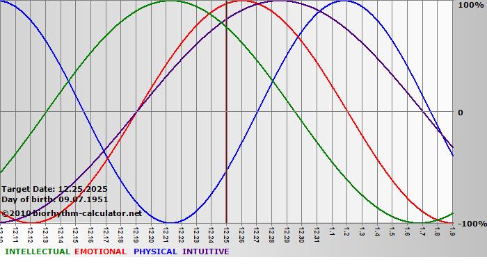 Your biorhythm above the horizontal line indicates that your capacity in that area is enhanced; you feel stronger, more alert, more connected, more empathetic. These are times when you are able to do more, be more, enjoy more. When the biorhythm lines are below 0%, your capacity is diminished, and conservative behavior is recommended.