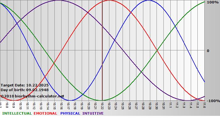 Your biorhythm above the horizontal line indicates that your capacity in that area is enhanced; you feel stronger, more alert, more connected, more empathetic. These are times when you are able to do more, be more, enjoy more. When the biorhythm lines are below 0%, your capacity is diminished, and conservative behavior is recommended.