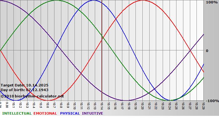 Your biorhythm above the horizontal line indicates that your capacity in that area is enhanced; you feel stronger, more alert, more connected, more empathetic. These are times when you are able to do more, be more, enjoy more. When the biorhythm lines are below 0%, your capacity is diminished, and conservative behavior is recommended.