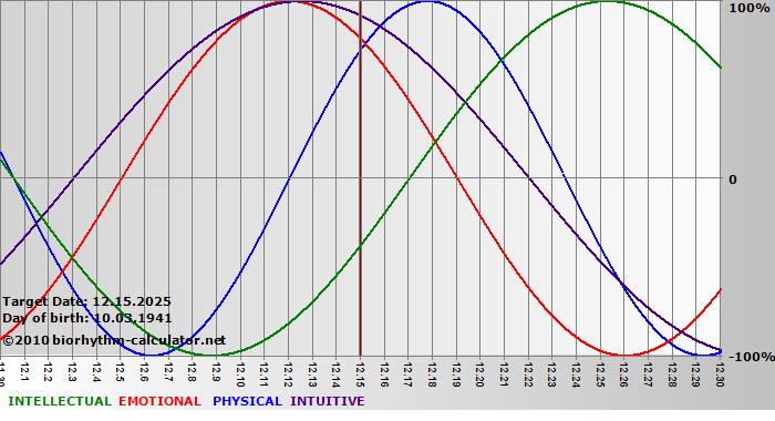 Your biorhythm above the horizontal line indicates that your capacity in that area is enhanced; you feel stronger, more alert, more connected, more empathetic. These are times when you are able to do more, be more, enjoy more. When the biorhythm lines are below 0%, your capacity is diminished, and conservative behavior is recommended.