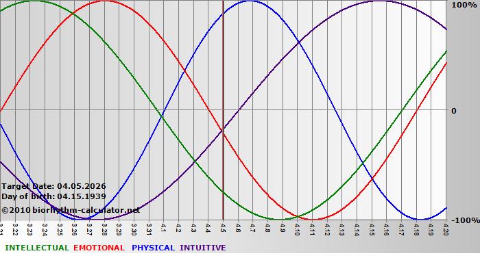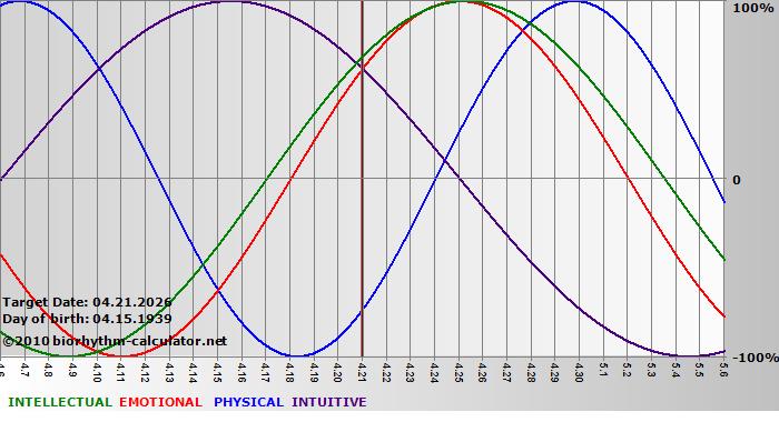 Your biorhythm above the horizontal line indicates that your capacity in that area is enhanced; you feel stronger, more alert, more connected, more empathetic. These are times when you are able to do more, be more, enjoy more. When the biorhythm lines are below 0%, your capacity is diminished, and conservative behavior is recommended.