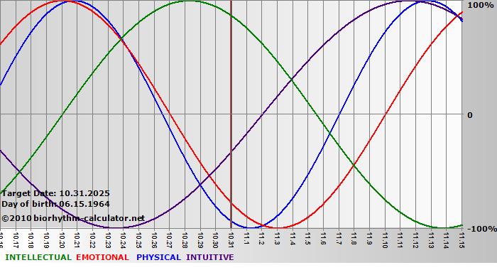 Your biorhythm above the horizontal line indicates that your capacity in that area is enhanced; you feel stronger, more alert, more connected, more empathetic. These are times when you are able to do more, be more, enjoy more. When the biorhythm lines are below 0%, your capacity is diminished, and conservative behavior is recommended.