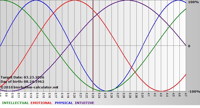 Your biorhythm above the horizontal line indicates that your capacity in that area is enhanced; you feel stronger, more alert, more connected, more empathetic. These are times when you are able to do more, be more, enjoy more. When the biorhythm lines are below 0%, your capacity is diminished, and conservative behavior is recommended.