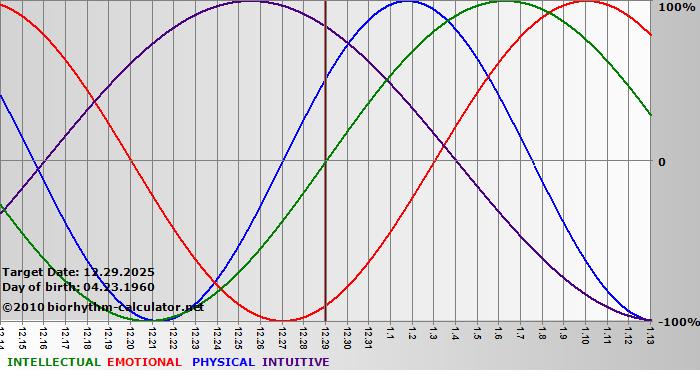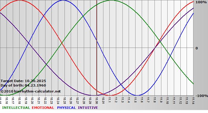 Your biorhythm above the horizontal line indicates that your capacity in that area is enhanced; you feel stronger, more alert, more connected, more empathetic. These are times when you are able to do more, be more, enjoy more. When the biorhythm lines are below 0%, your capacity is diminished, and conservative behavior is recommended.
