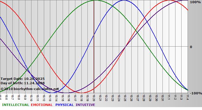 Your biorhythm above the horizontal line indicates that your capacity in that area is enhanced; you feel stronger, more alert, more connected, more empathetic. These are times when you are able to do more, be more, enjoy more. When the biorhythm lines are below 0%, your capacity is diminished, and conservative behavior is recommended.