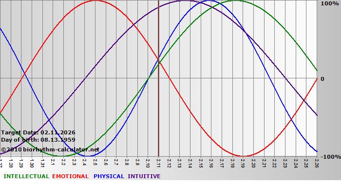 Your biorhythm above the horizontal line indicates that your capacity in that area is enhanced; you feel stronger, more alert, more connected, more empathetic. These are times when you are able to do more, be more, enjoy more. When the biorhythm lines are below 0%, your capacity is diminished, and conservative behavior is recommended.
