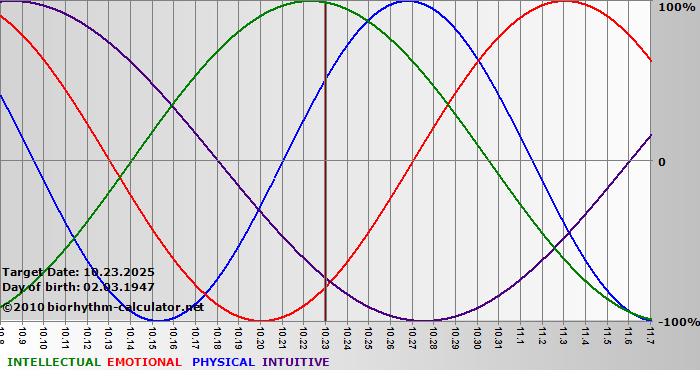 Your biorhythm above the horizontal line indicates that your capacity in that area is enhanced; you feel stronger, more alert, more connected, more empathetic. These are times when you are able to do more, be more, enjoy more. When the biorhythm lines are below 0%, your capacity is diminished, and conservative behavior is recommended.