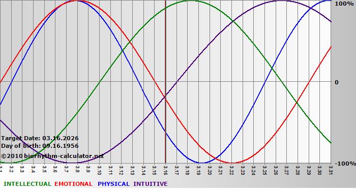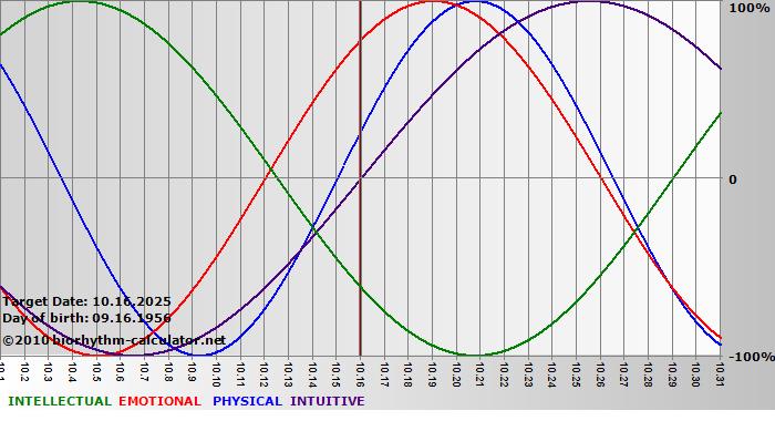 Your biorhythm above the horizontal line indicates that your capacity in that area is enhanced; you feel stronger, more alert, more connected, more empathetic. These are times when you are able to do more, be more, enjoy more. When the biorhythm lines are below 0%, your capacity is diminished, and conservative behavior is recommended.
