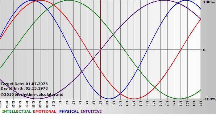 Your biorhythm above the horizontal line indicates that your capacity in that area is enhanced; you feel stronger, more alert, more connected, more empathetic. These are times when you are able to do more, be more, enjoy more. When the biorhythm lines are below 0%, your capacity is diminished, and conservative behavior is recommended.