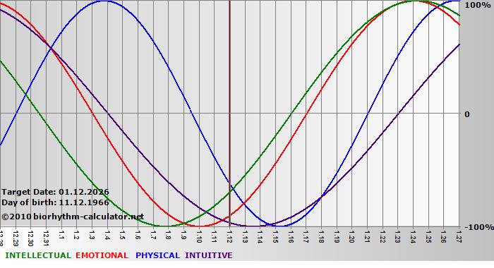 Your biorhythm above the horizontal line indicates that your capacity in that area is enhanced; you feel stronger, more alert, more connected, more empathetic. These are times when you are able to do more, be more, enjoy more. When the biorhythm lines are below 0%, your capacity is diminished, and conservative behavior is recommended.