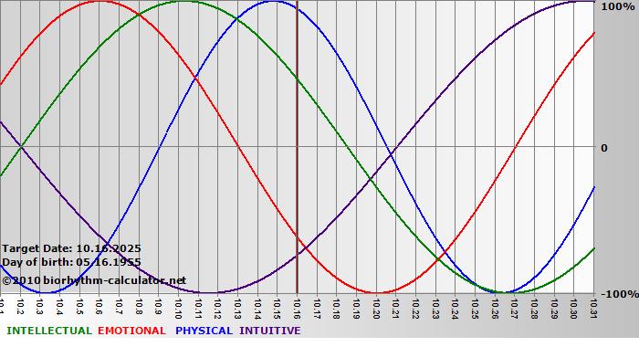 Your biorhythm above the horizontal line indicates that your capacity in that area is enhanced; you feel stronger, more alert, more connected, more empathetic. These are times when you are able to do more, be more, enjoy more. When the biorhythm lines are below 0%, your capacity is diminished, and conservative behavior is recommended.