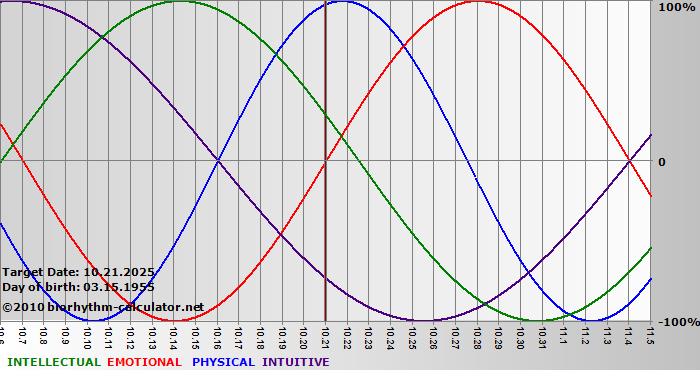 Your biorhythm above the horizontal line indicates that your capacity in that area is enhanced; you feel stronger, more alert, more connected, more empathetic. These are times when you are able to do more, be more, enjoy more. When the biorhythm lines are below 0%, your capacity is diminished, and conservative behavior is recommended.