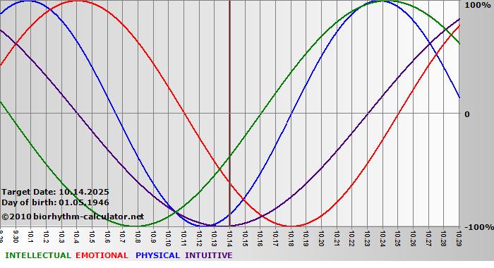 Your biorhythm above the horizontal line indicates that your capacity in that area is enhanced; you feel stronger, more alert, more connected, more empathetic. These are times when you are able to do more, be more, enjoy more. When the biorhythm lines are below 0%, your capacity is diminished, and conservative behavior is recommended.