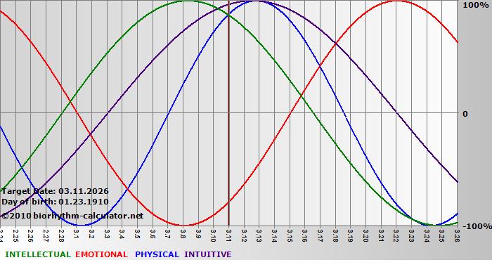 Your biorhythm above the horizontal line indicates that your capacity in that area is enhanced; you feel stronger, more alert, more connected, more empathetic. These are times when you are able to do more, be more, enjoy more. When the biorhythm lines are below 0%, your capacity is diminished, and conservative behavior is recommended.