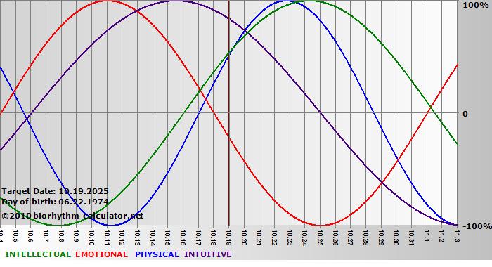 Your biorhythm above the horizontal line indicates that your capacity in that area is enhanced; you feel stronger, more alert, more connected, more empathetic. These are times when you are able to do more, be more, enjoy more. When the biorhythm lines are below 0%, your capacity is diminished, and conservative behavior is recommended.