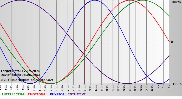 Your biorhythm above the horizontal line indicates that your capacity in that area is enhanced; you feel stronger, more alert, more connected, more empathetic. These are times when you are able to do more, be more, enjoy more. When the biorhythm lines are below 0%, your capacity is diminished, and conservative behavior is recommended.