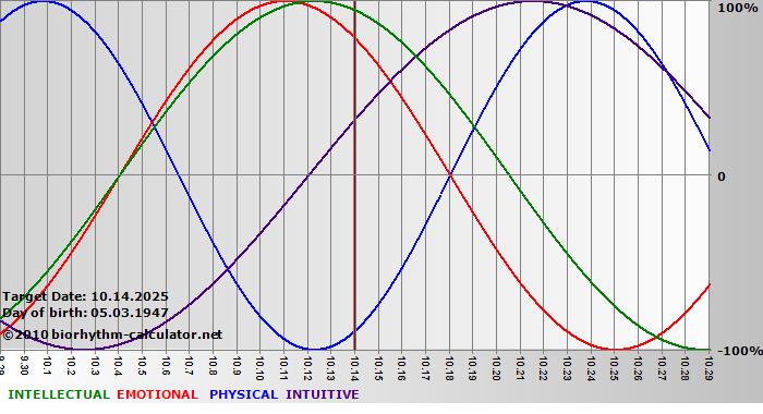 Your biorhythm above the horizontal line indicates that your capacity in that area is enhanced; you feel stronger, more alert, more connected, more empathetic. These are times when you are able to do more, be more, enjoy more. When the biorhythm lines are below 0%, your capacity is diminished, and conservative behavior is recommended.