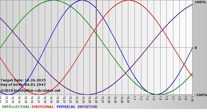 Your biorhythm above the horizontal line indicates that your capacity in that area is enhanced; you feel stronger, more alert, more connected, more empathetic. These are times when you are able to do more, be more, enjoy more. When the biorhythm lines are below 0%, your capacity is diminished, and conservative behavior is recommended.